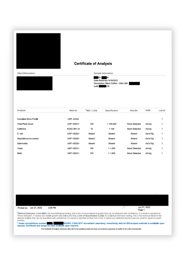 Almost all lower quality coffee brands contain mycotoxins. Yuck! In fact, one study found that over 90% of green coffee beans were contaminated with mold. (And that's before processing. Yikes!) These molds and toxins are bad news for your health. At Vibra360, we want to make sure you feel good about the coffee you put in your body... So we have ours tested to ensure you're drinking coffee of the highest quality. (21)